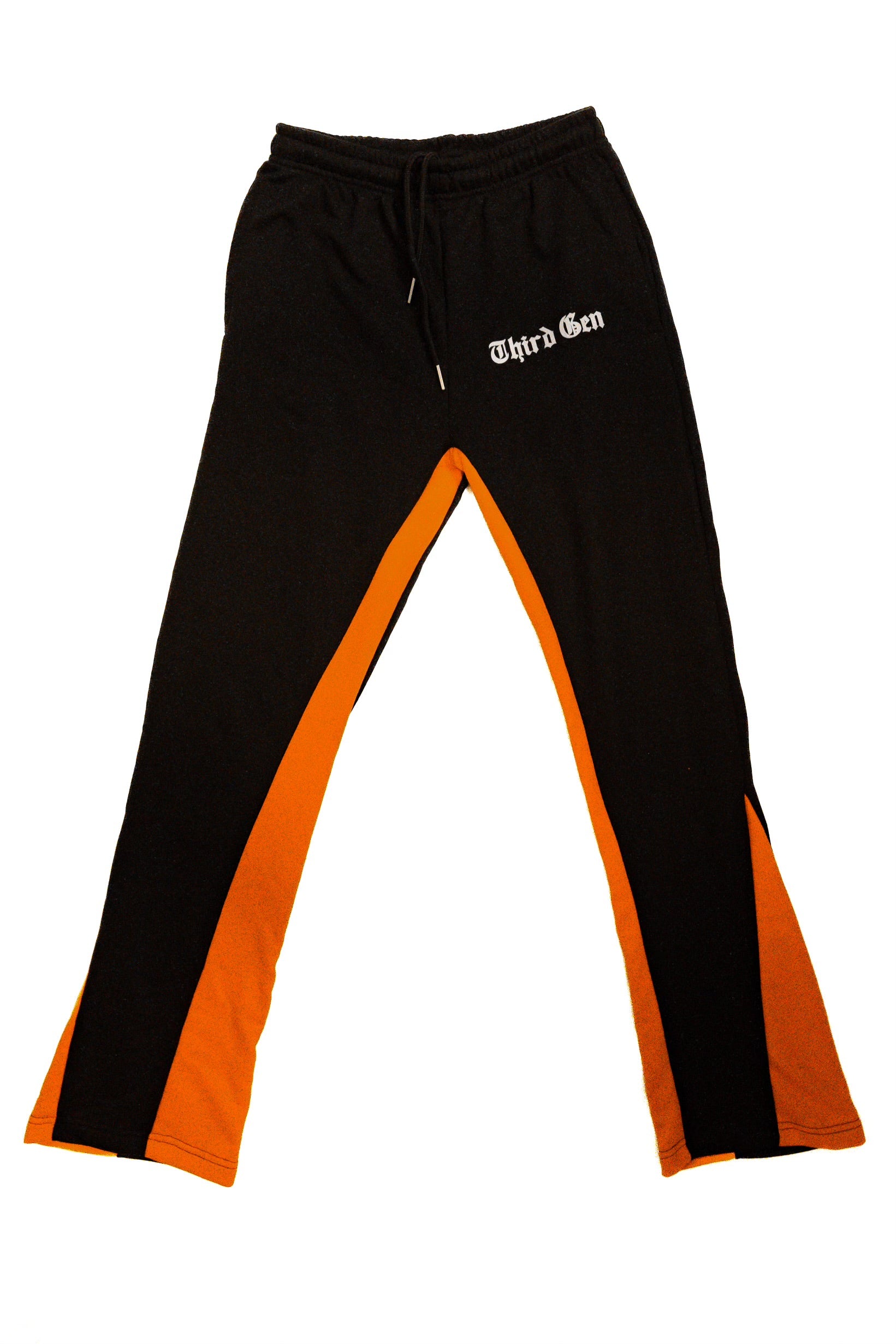 Flare sweatpants in black cotton with "Third Gen" printed in white with a tad of orange. Paired with the "Third Gen" Double Logo T-Shirt.